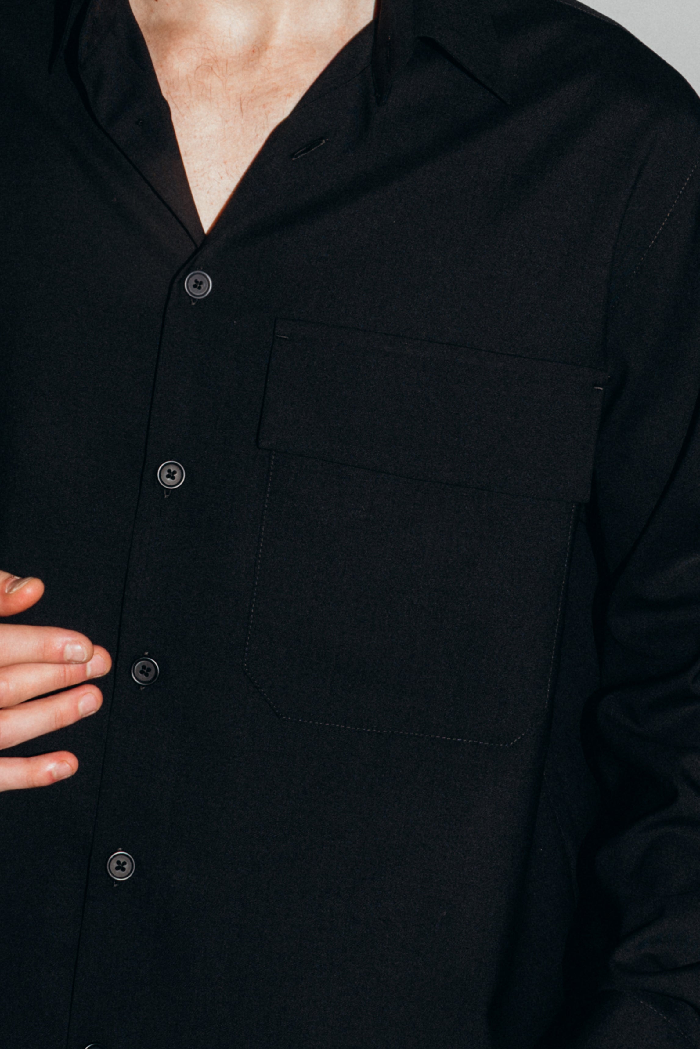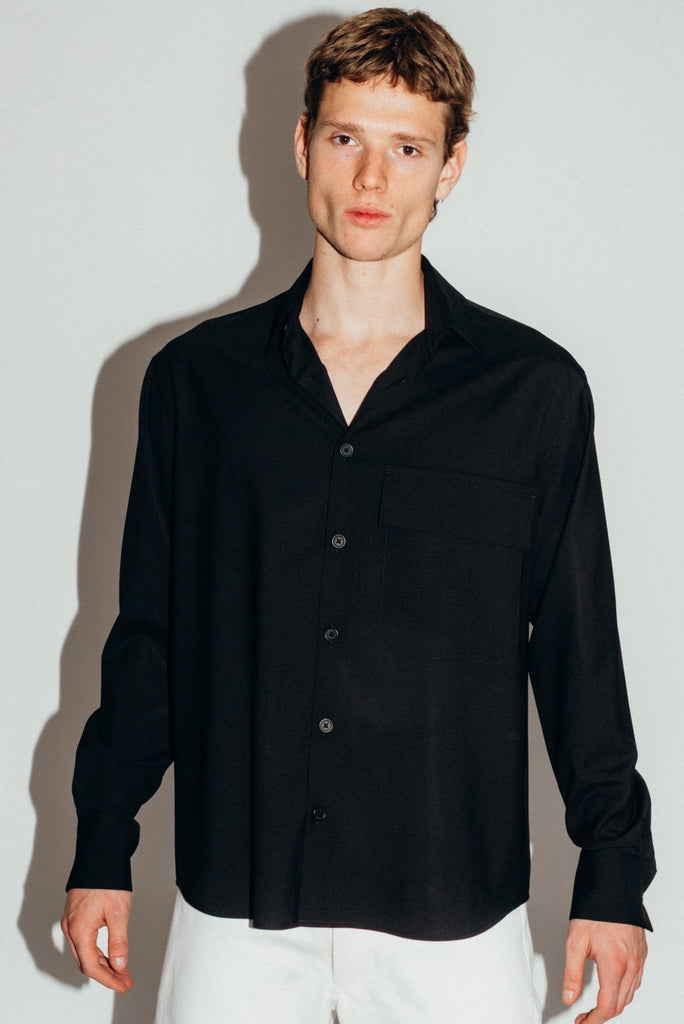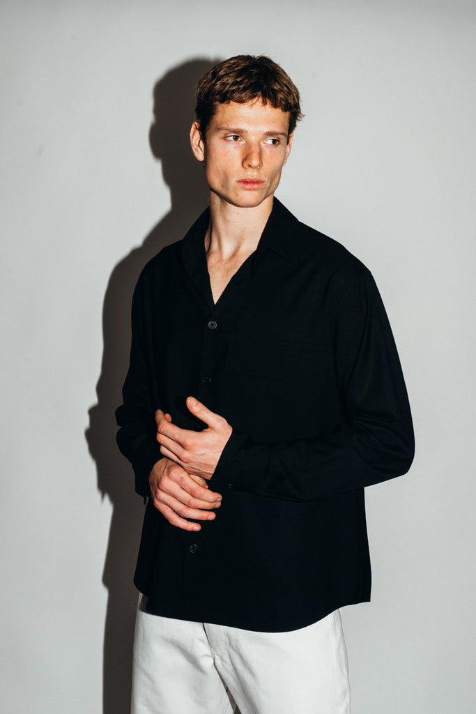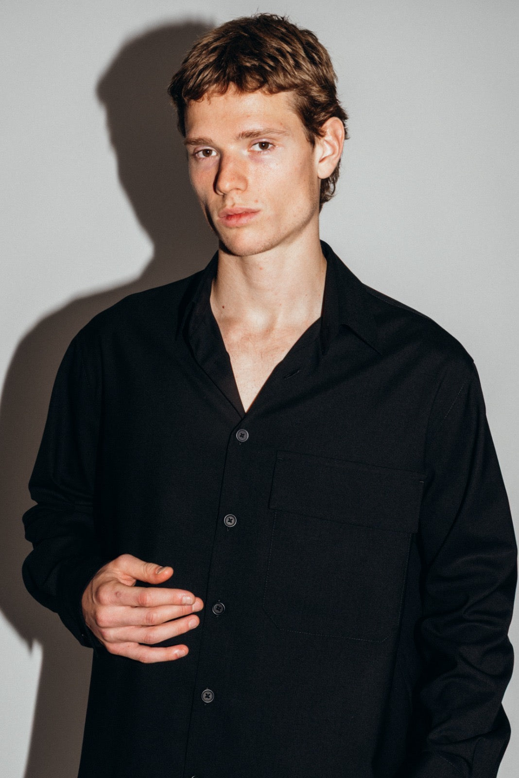 Een verfijnd loose fit shirt, gemaakt van 100% Cool Wool — een lichte, ademende wolsoort die altijd koel aanvoelt op de huid.